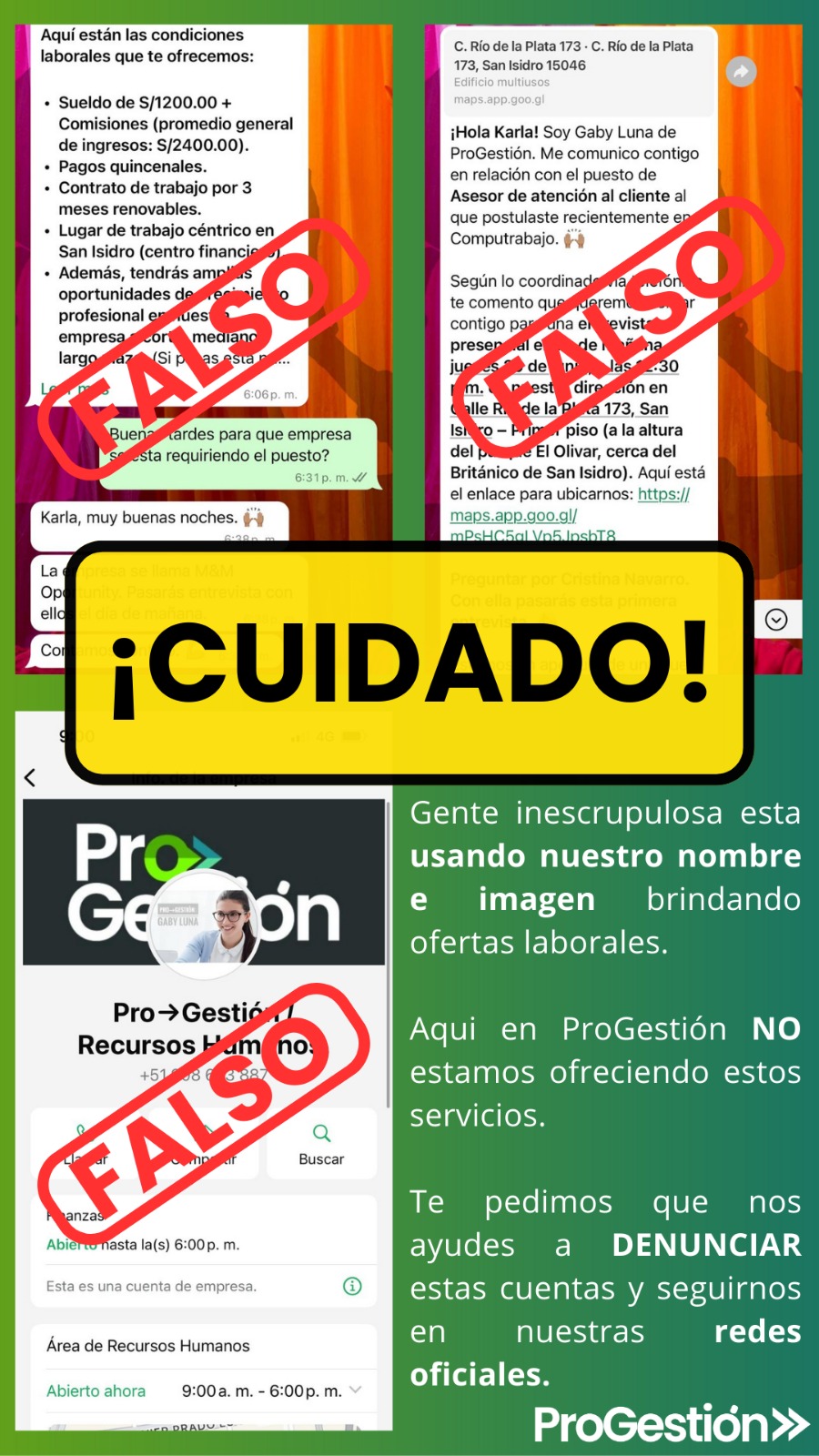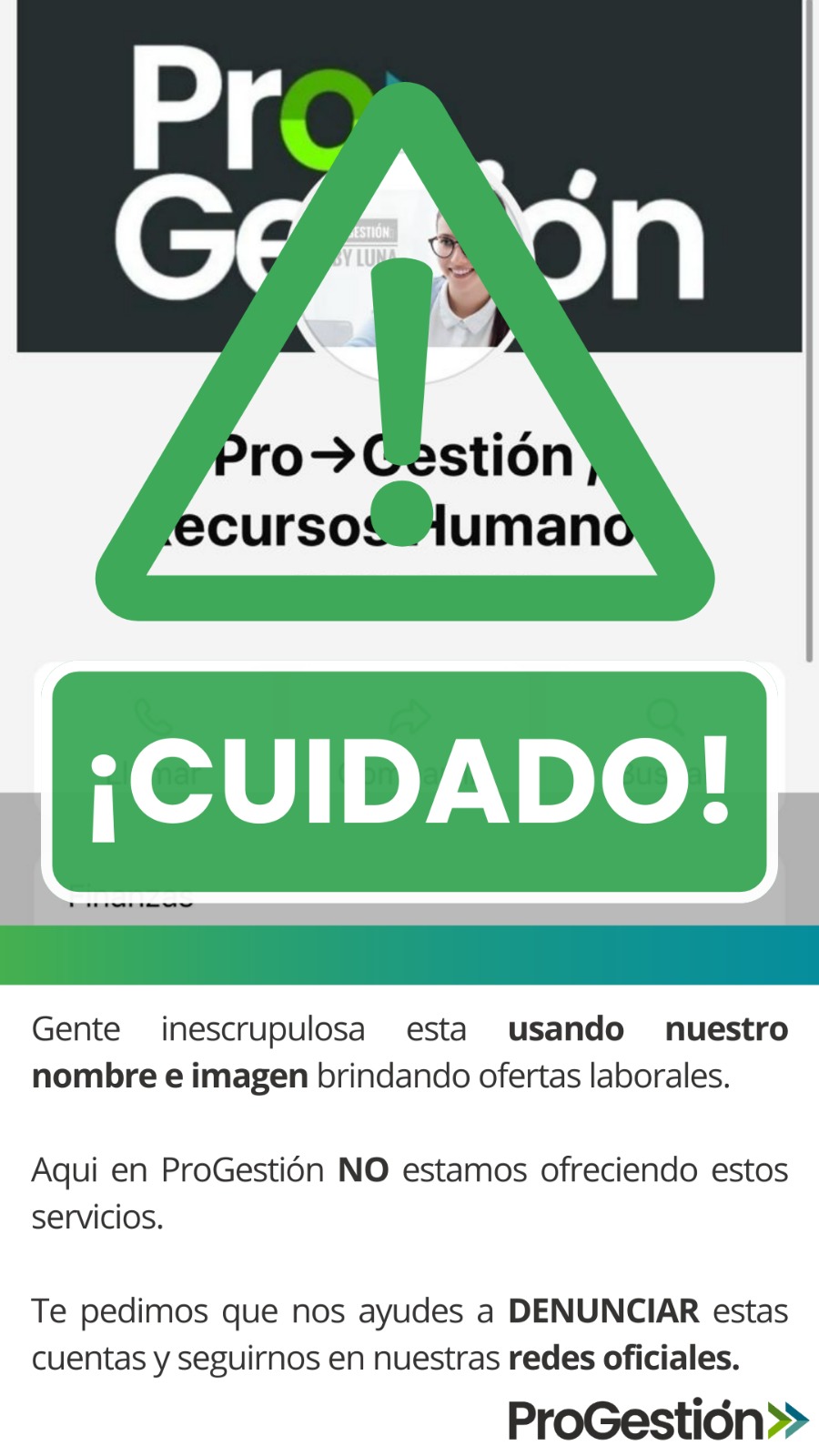 Pro Gestión está tomando todas las medidas necesarias para denunciar y eliminar esta cuenta falsa y evitar que nuestros clientes sean víctimas de fraudes. Agradecemos su comprensión y colaboración en este asunto.